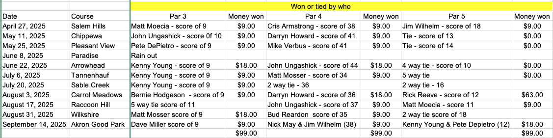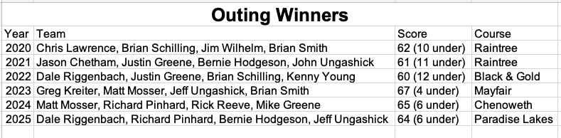 2022 Kenny Young (score of 22) 2023 - John Ungashick & Andy Lillo (Matt Mosser) (tied score of 30). 2024 - Jason Hentzell (score of 29) 2025 - Jeff Ungashick (score of -1) - (changed scoring in 2025)